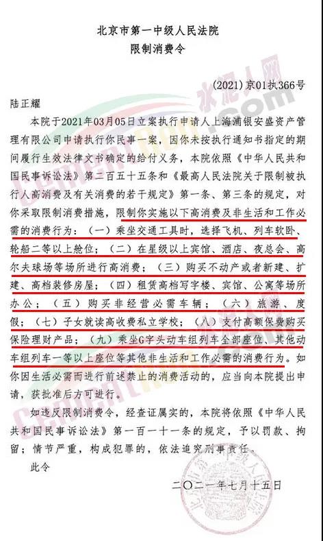 日前,水泥人網(wǎng)從中國執(zhí)行信息公開網(wǎng)獲悉,7月15日,陸正耀新增一則限制消費令信息,申請人為上海浦銀安盛資產(chǎn)管理有限公司,發(fā)布法院為北京市第一中級人民法院。關聯(lián)執(zhí)行案件立案時間為2021年3月5日,執(zhí)行標的超9.35億元。據(jù)天眼查,陸正耀是瑞幸咖啡創(chuàng)始人、神州租車創(chuàng)始人,其名下還有神州優(yōu)車等公司。限制實施以下高消費及非生活和工作必需的消費行為∶