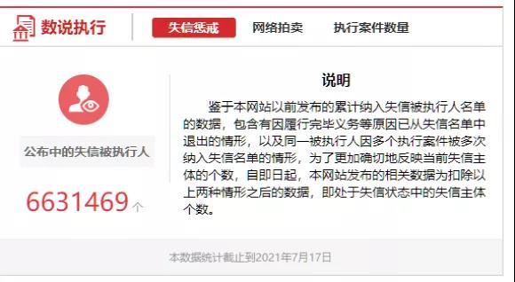 中國執(zhí)行信息公開網(wǎng)消息,截止2021年7月17日公布的失信被執(zhí)行人達6631469個。