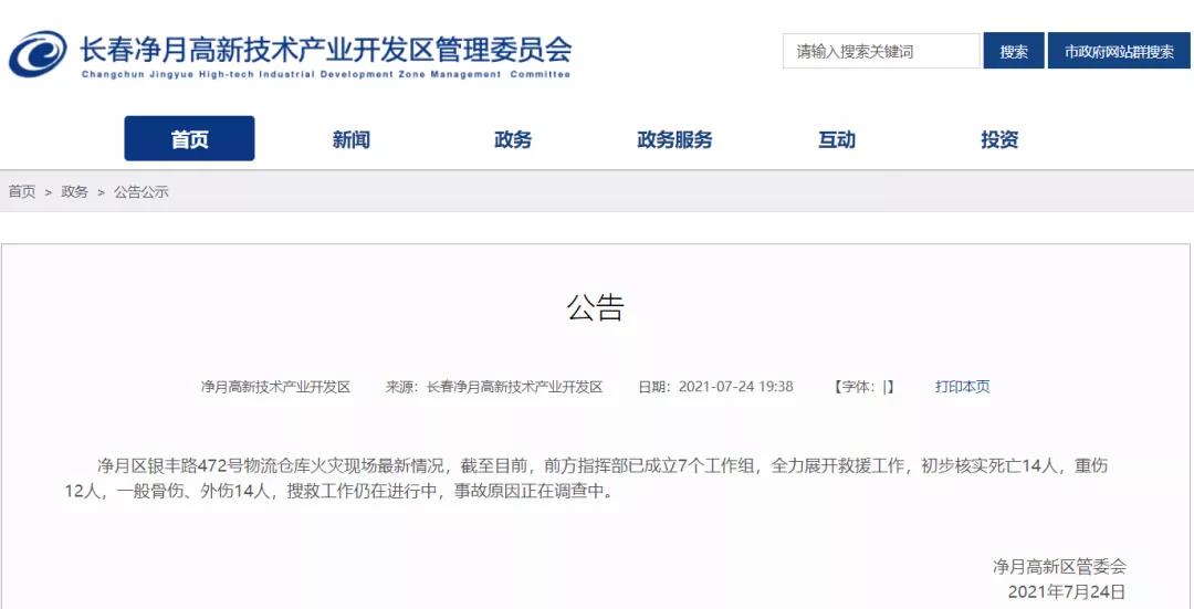 記者從長(zhǎng)春凈月高新技術(shù)產(chǎn)業(yè)開(kāi)發(fā)區(qū)了解到,該區(qū)一物流倉(cāng)庫(kù)24日下午發(fā)生火災(zāi)。截至記者發(fā)稿時(shí),初步核實(shí)死亡14人,重傷12人,一般骨傷、外傷14人,搜救工作仍在進(jìn)行中,事故原因正在調(diào)查中。