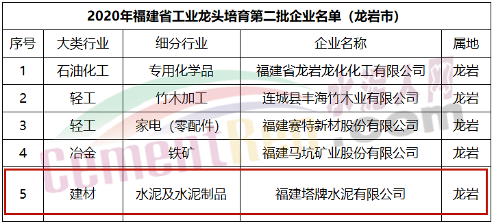 日前,福建省工信廳發(fā)布了《關(guān)于發(fā)布福建省工業(yè)龍頭企業(yè)名單(第二批)的通知》,《通知》稱,武平縣的福建塔牌水泥有限公司被認(rèn)定為2021年福建省工業(yè)龍頭培育企業(yè),為龍巖市5家企業(yè)之一。具體《通知》如下: