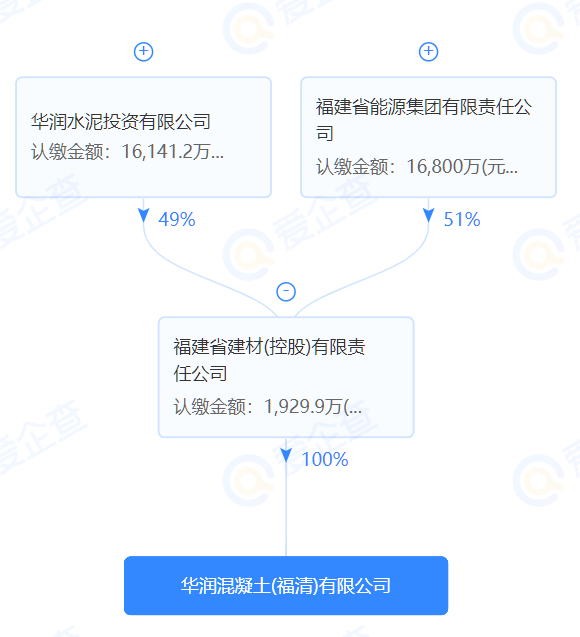 據(jù)查詢,華潤混凝土(福清)有限公司為福建省建材(控股)有限公司100%控股子公司,為福建省能源集團(tuán)有限責(zé)任公司和華潤水泥投資有限公司間接股權(quán)公司。
