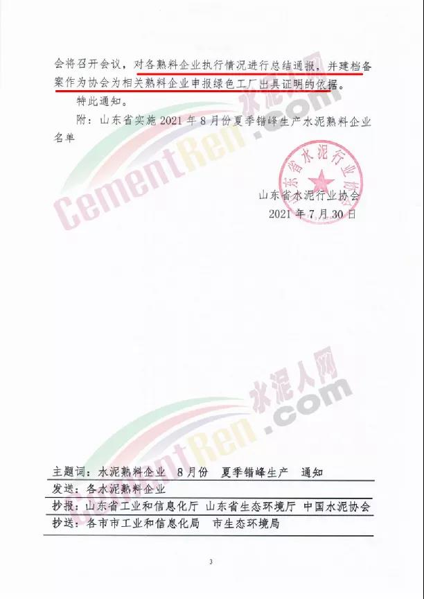 7月30日山東省水泥行業(yè)協(xié)會發(fā)布《關(guān)于山東省水泥熟料企業(yè)開展2021年8月份夏季錯峰生產(chǎn)的通知》稱按照相關(guān)文件要求將組織山東省水泥熟料企業(yè)的熟料生產(chǎn)線實施2021年8月份夏季錯峰生產(chǎn)。