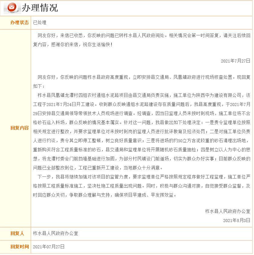 隔日相關部門就作了回復稱,網友反映的問題已轉柞水縣人民政府閱處。
