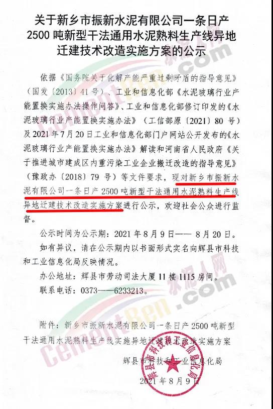 日前,河南新鄉(xiāng)輝縣市人民政府發(fā)布《關(guān)于新鄉(xiāng)市振新水泥有限公司一條日產(chǎn)2500噸新型干法通用水泥熟料生產(chǎn)線異地遷建技術(shù)改造實施方案的公示》。