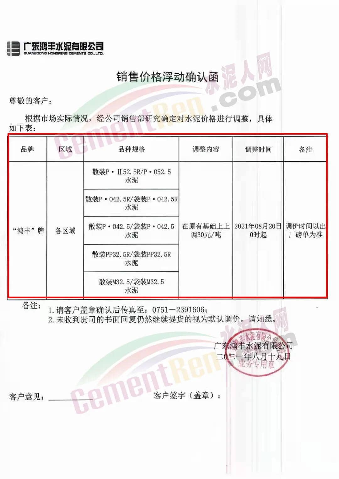 廣東鴻豐水泥有限公司通知,自8月20日0時(shí)起各標(biāo)號(hào)水泥上調(diào)30元/噸。