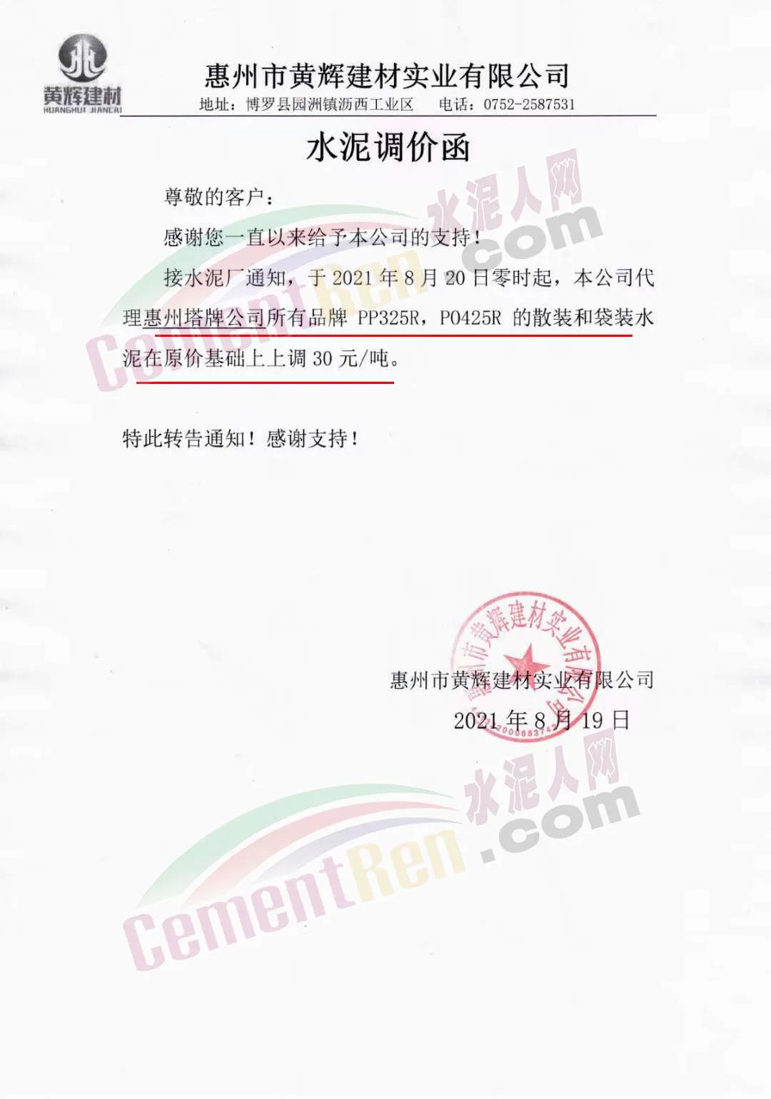 惠州市順達(dá)水泥粉磨有限公司通知,自8月20日早7時(shí)起,旗下各標(biāo)號(hào)水泥上調(diào)30元/噸。