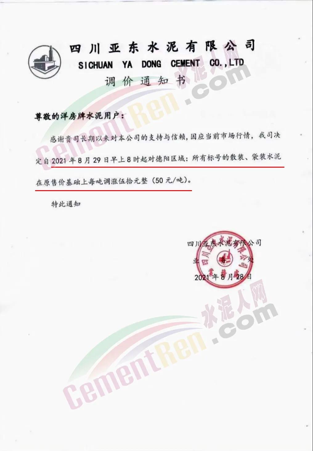 四川亞東水泥通知,自8月29日8時起,對德陽區(qū)域所有標號的散裝、袋裝水泥在原售價基礎上調(diào)漲50元/噸。