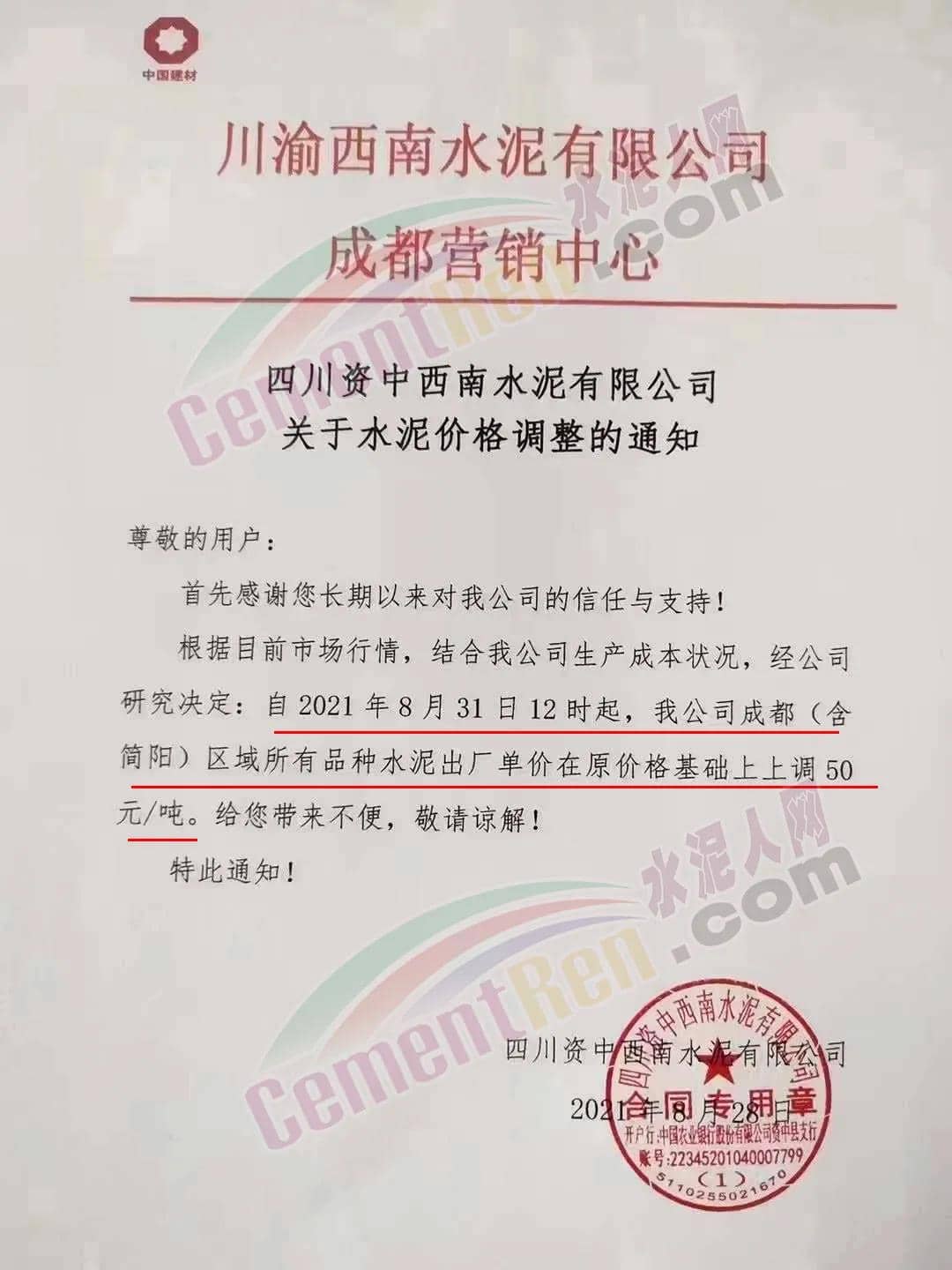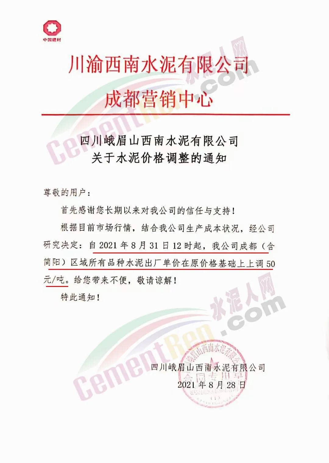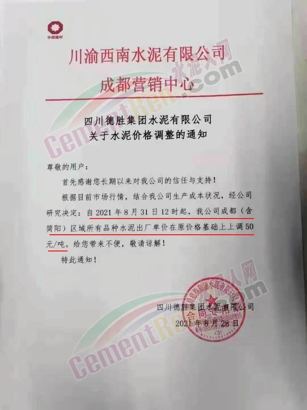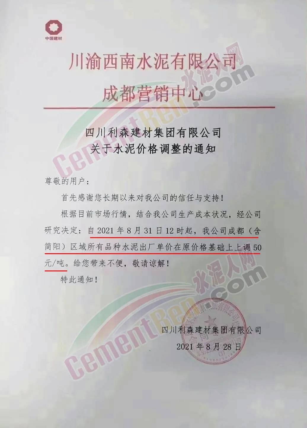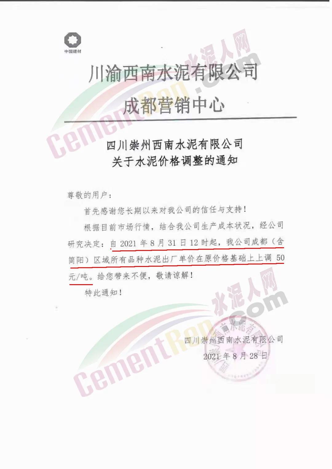 安縣中聯(lián)水泥、崇州西南水泥、四川德勝集團、峨眉山西南水泥、四川利森集團、綿竹澳東水泥、女媧建材等通知稱,根據(jù)目前市場行情 ,結合公司生產(chǎn)成本狀態(tài),經(jīng)公司研究決定自8月31日12時起,成都(含簡陽)區(qū)域所有品牌水泥出廠單價在原價基礎上上調(diào)50元/噸。