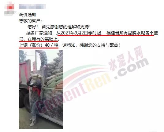 有經銷商發(fā)通知稱,從9月2日零時起 ,福建省內所有品牌水泥各個型號在原有基礎上上調40元/噸。