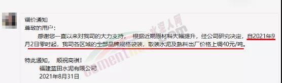 福建藍田水泥通知,因近期原材料大幅提升,經公司研究決定,自9月2日零時起,各區(qū)域全部品牌規(guī)格袋裝、散裝水泥及熟料出廠價格上調40元/噸。