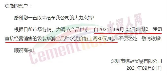 深圳市棕冠貿易有限公司通知,根據(jù)目前市場行情,為調節(jié)產品供求,自2021年9月2日0時起,公司直接經營銷售的袋裝華潤全品種水泥價格上調30元/噸。