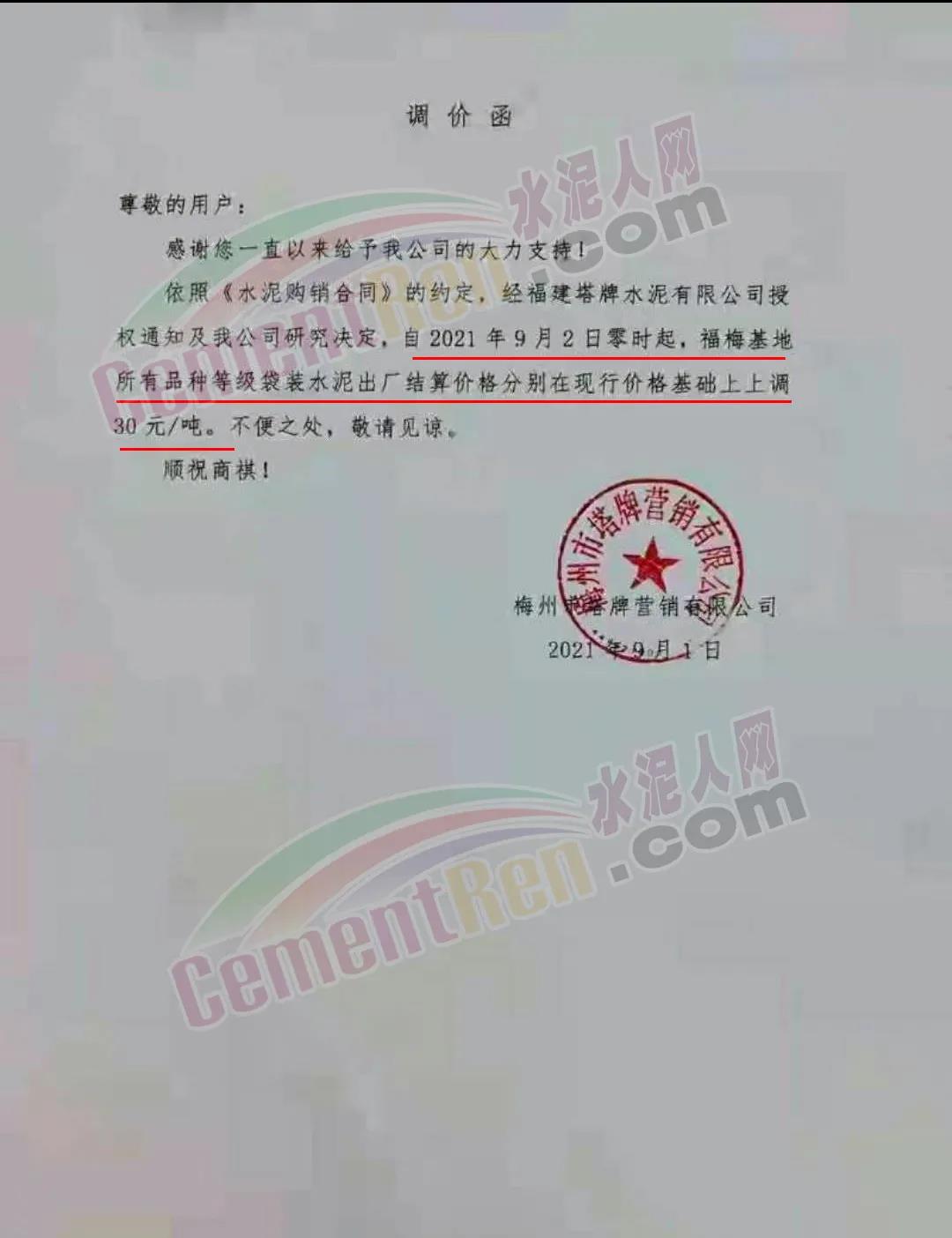 梅州市塔牌營銷有限公司通知從9月2日零時起,福梅基地所有品種等級袋裝水泥出廠結算價分別在現(xiàn)行價格基礎上上調30元/噸。
