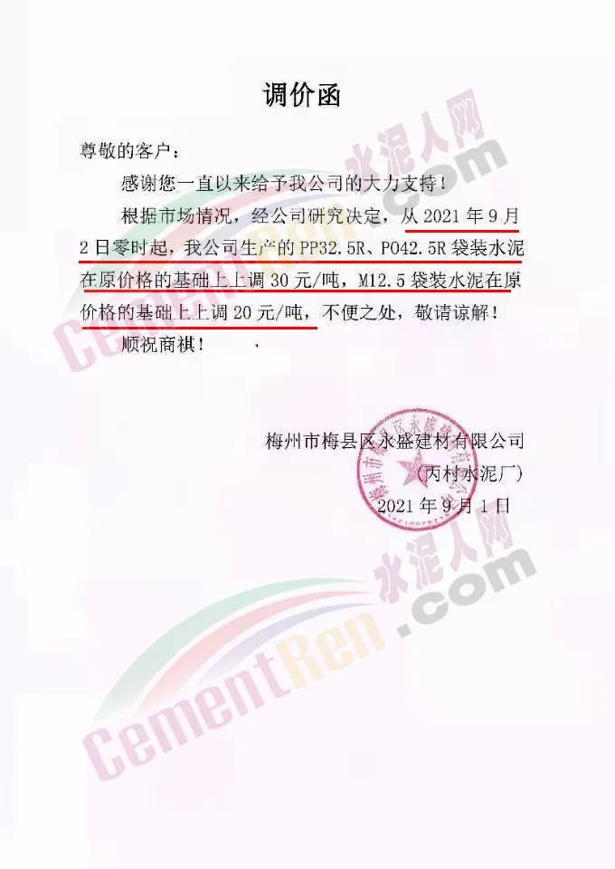 梅州市梅縣區(qū)金輝建材有限公司通知,自2021年9月2日零時起,PO42.5R、PP32.5R袋裝水泥在現(xiàn)有結算價格基礎上上調30元/噸,M12.5 袋裝水泥在現(xiàn)有結算價格基礎上上調 20 元/噸。