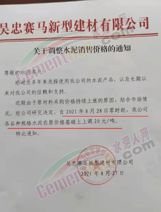 另據(jù)消息稱,寧夏區(qū)域多家品牌企業(yè)也于近日上調了水泥價格。寧夏吳忠賽馬新型建材有限公司通知 ,由于原材料采購價格持續(xù)上漲的原因,結合市場情況經公司研究決定 ,自2021年8月28日零時起,公司各品種規(guī)格水泥在原價基礎上上調20元/噸。
