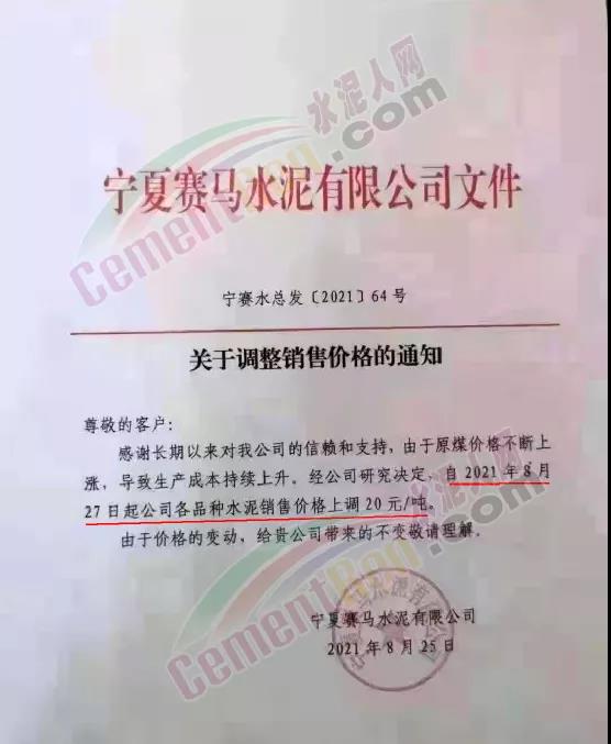 寧夏賽馬水泥有限公司通知稱,8月27日起公司各品種水泥銷售價格上調20元/噸。