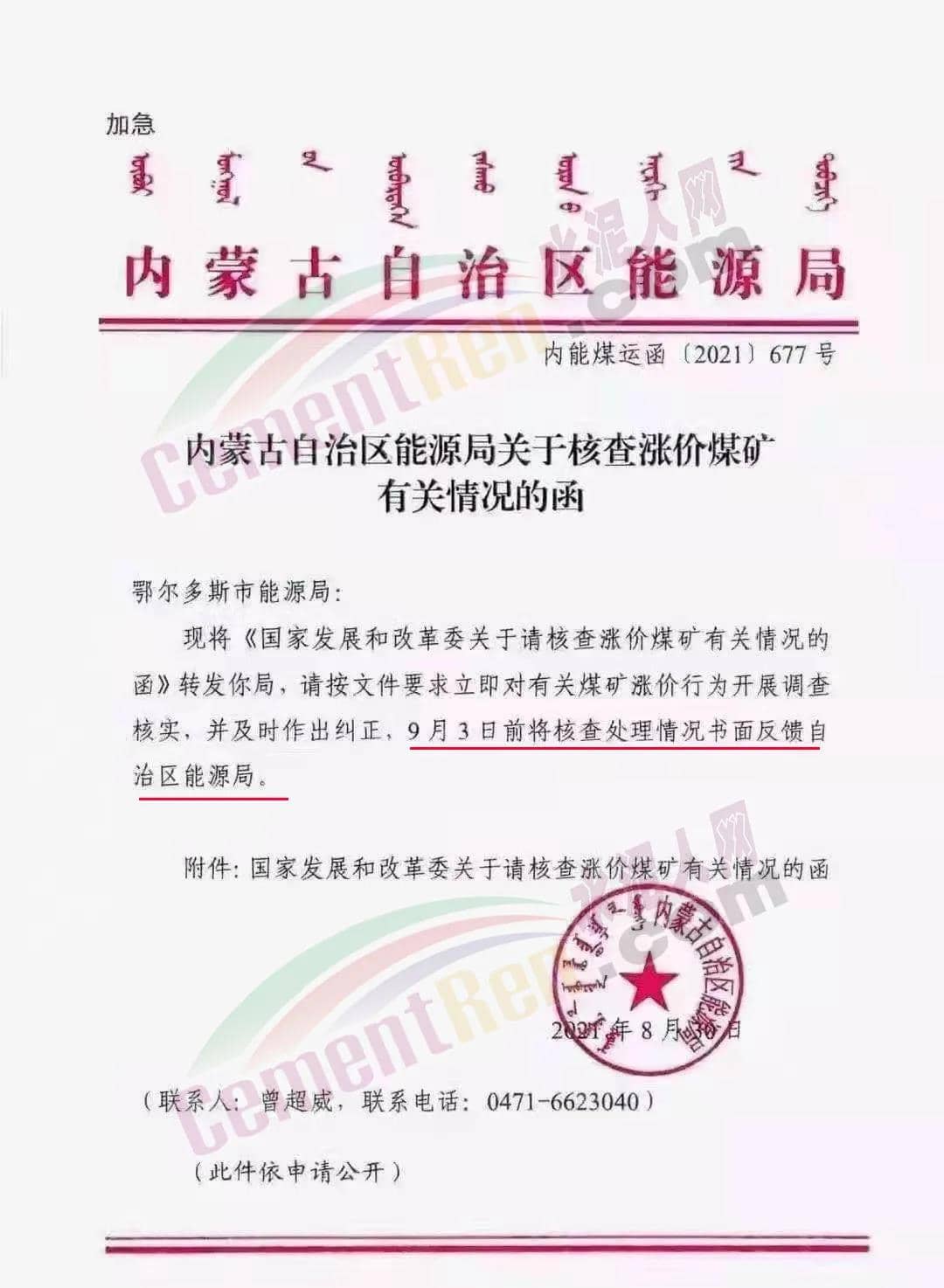 同日,內(nèi)蒙古自治區(qū)能源局發(fā)《關(guān)于核查漲價煤礦有關(guān)情況的函》給鄂爾多斯市能源局要求立即對有關(guān)煤礦漲價行為開展調(diào)查核實,并及時作出糾正,9月3日前將核查處理情況書面反饋自治區(qū)能源局。