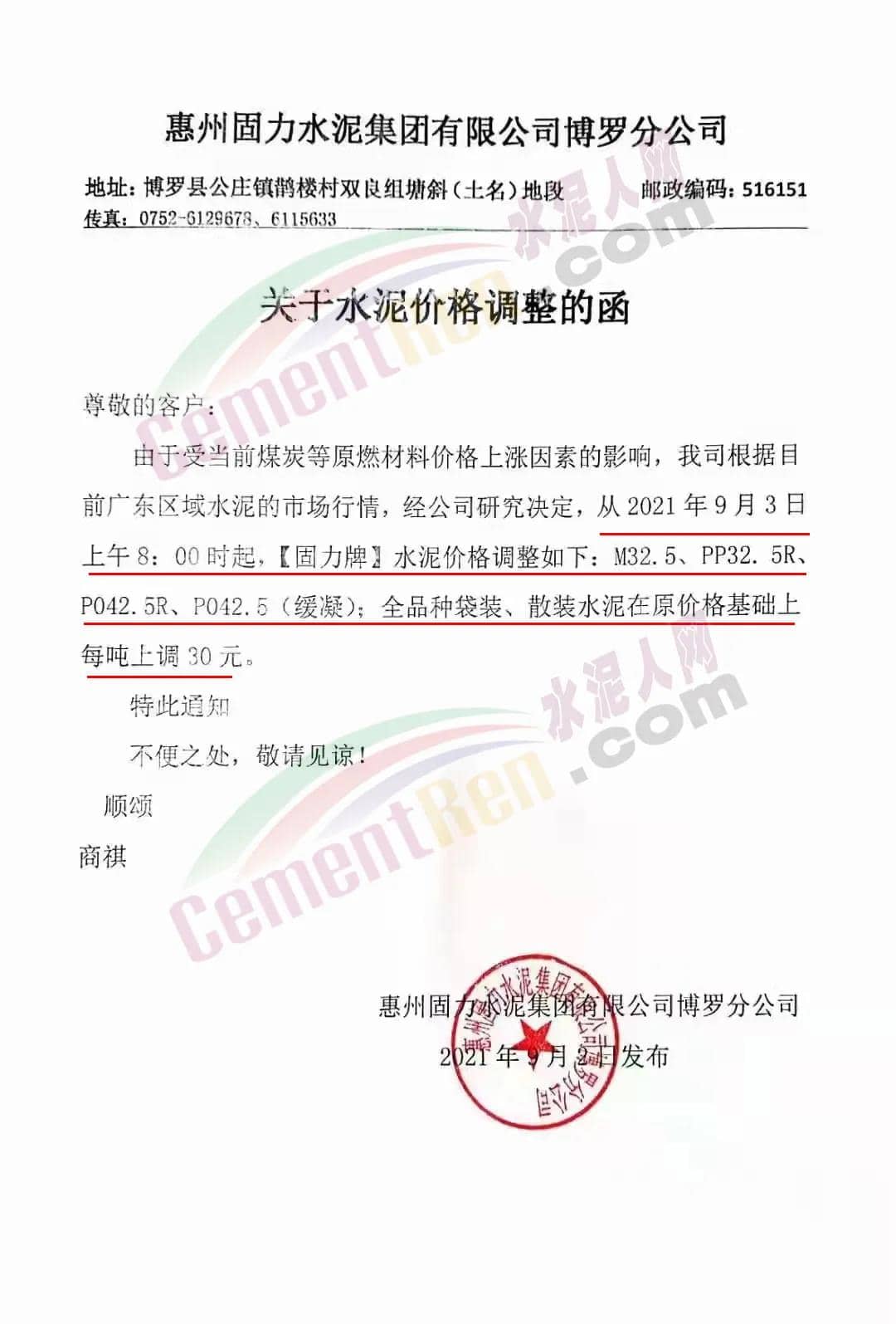 惠州市光大水泥企業(yè)有限公司通知,從2021年9月3日0時起,公司銷往惠州區(qū)域(含河源片區(qū))的散裝水泥和包裝水泥在原有價格的基礎(chǔ)上上調(diào)30元/噸。