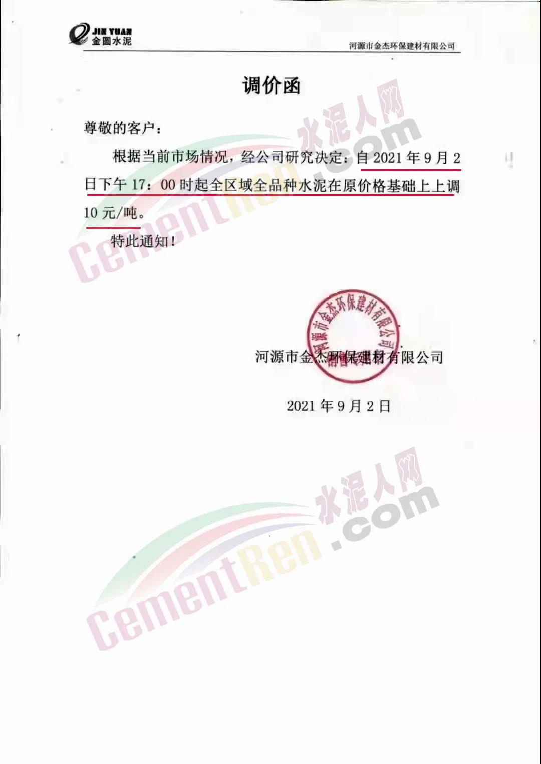 河源市金杰環(huán)保建材有限公司通知,根據(jù)當(dāng)前市場情況,經(jīng)公司研究決定自 2021年9月2日下午17時起全區(qū)域全品種水泥在原價格基礎(chǔ)上上調(diào)10元/噸。