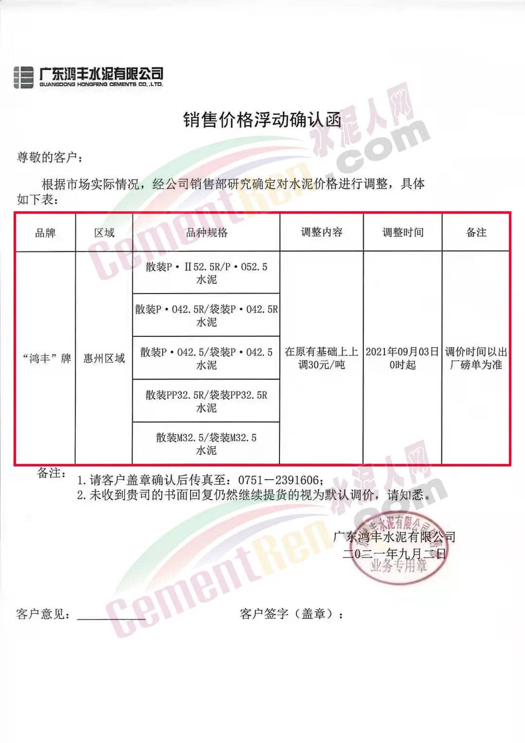 廣東鴻豐水泥有限公司通知,自2021年9月3日起,公司惠州區(qū)域“鴻豐”牌水泥各標(biāo)號上調(diào)30元/噸。