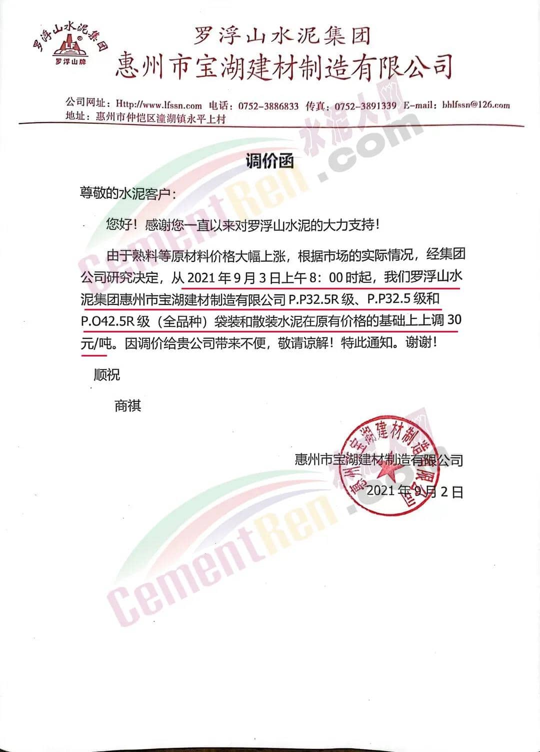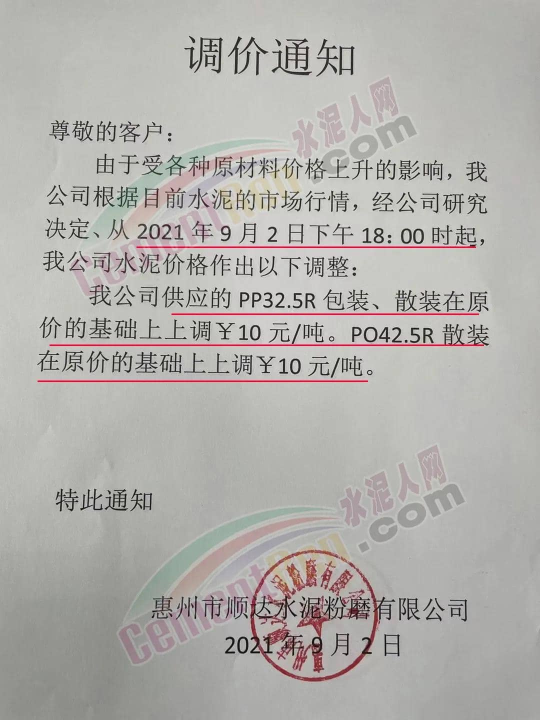 由于受各種原材料價格上升的影響,公司根據(jù)目前水泥的市場行情,經(jīng)研究決定從2021年9月2日下午18時起,公司供應(yīng)的PP32.5R包裝、散裝在原價的基礎(chǔ)上上調(diào)10元/噸。PO42.5R散裝在原價的基礎(chǔ)上上調(diào)10元/噸。