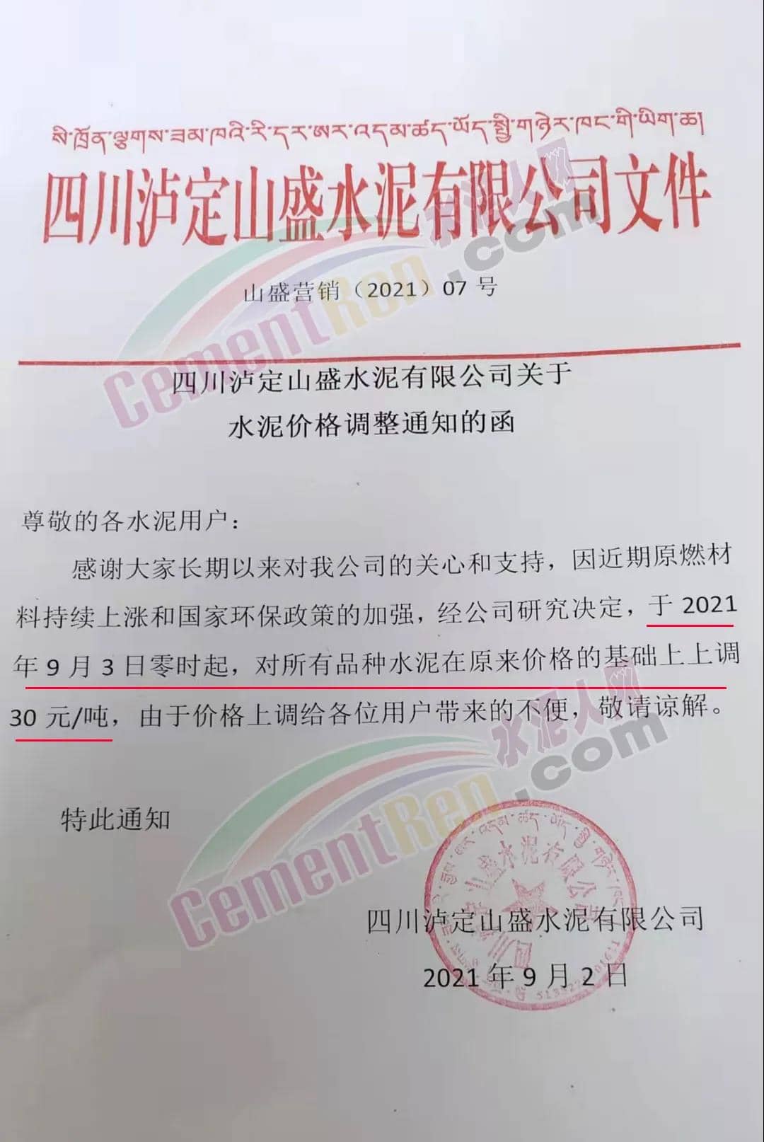 四川瀘定山盛水泥有限公司通知,因近期原燃材料持續(xù)上漲和國家環(huán)保政策的加強,經(jīng)公司研究決定,于2021年9月3日零時起,對所有品種水泥在原來價格的基礎(chǔ)上上調(diào)30元/噸。