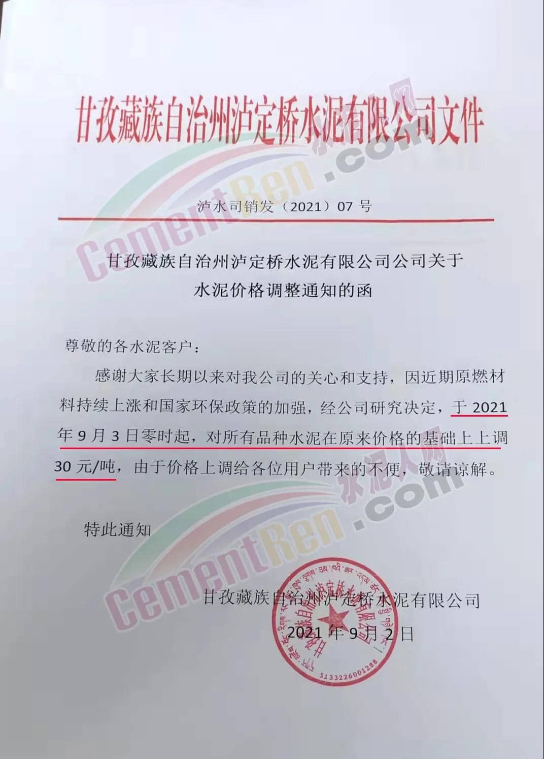 甘孜藏族自治州瀘定橋水泥有限公司通知,因近期原燃材料持續(xù)上漲和國家環(huán)保政策的加強,經(jīng)公司研究決定,于2021年9月3日零時起,對所有品種水泥在原來價格的基礎(chǔ)上上調(diào)30元/噸。