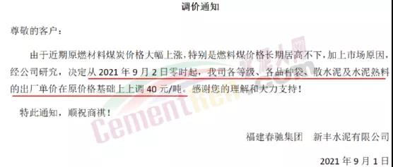 福建春馳集團(tuán)新豐水泥有限公司通知由于近期原燃材料煤炭價格大幅上漲,特別是燃料煤價格長期居高不下,加上市場原因,經(jīng)公司研究,決定從2021年9月2日零時起,公司各等級、各品種袋、散水泥及水泥熟料的出廠單價在原價格基礎(chǔ)上上調(diào)40元/噸。