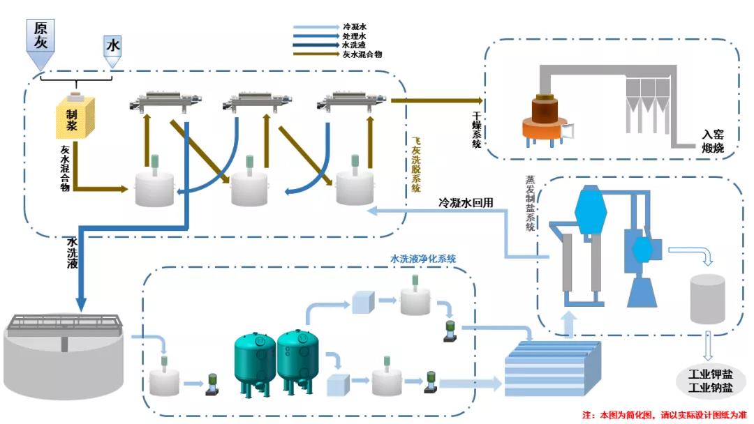 該項目成功應用中科國潤自主研發(fā)的FWD技術(即:飛灰水洗脫鹽技術),利用三級或多級逆流漂洗技術對飛灰、窯灰或類似粉體物料進行水洗以脫除物料中的可溶性物質,進而達到二次利用或脫毒的目的。“FWD裝備“由飛灰洗脫系統(tǒng)、水洗液凈化系統(tǒng)、蒸發(fā)制鹽系統(tǒng)、干燥系統(tǒng)等四大系統(tǒng)組成。實現(xiàn)了飛灰的無害化、減量化和資源化處置。全過程廢水零排放,無廢渣產(chǎn)生,無二次污染。