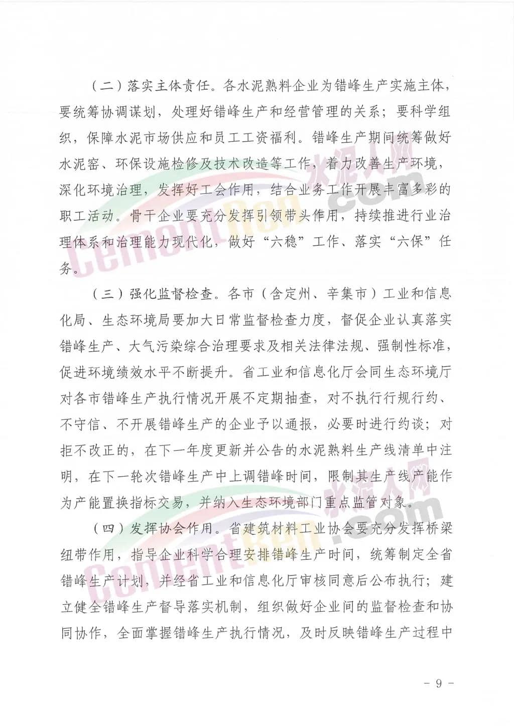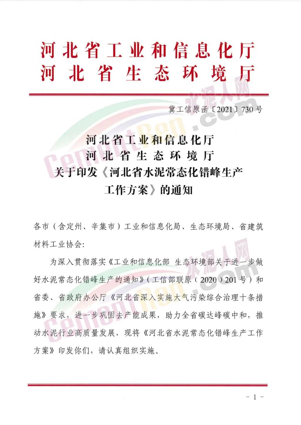 日前,河北省工業(yè)和信息化廳聯(lián)合河北省生態(tài)環(huán)境廳發(fā)布關(guān)于印發(fā)《河北省水泥常態(tài)化錯峰生產(chǎn)工作方案》的通知給各市(含定州、辛集市)工業(yè)和信息化局、生態(tài)環(huán)境局、省建筑材料工業(yè)協(xié)會稱,為深入貫徹落實《工業(yè)和信息化部生態(tài)環(huán)境部關(guān)于進一步做好水泥常態(tài)化錯峰生產(chǎn)的通知》(工信部聯(lián)原〔2020)201號)和省委、省政府辦公廳《河北省深入實施大氣污染綜合治理十條措施》要求,進一步鞏固去產(chǎn)能成果,助力全省碳達峰碳中和,推動水泥行業(yè)高質(zhì)量發(fā)展,印發(fā)《河北省水泥常態(tài)化錯峰生產(chǎn)工作方案》,請認真組織實施。