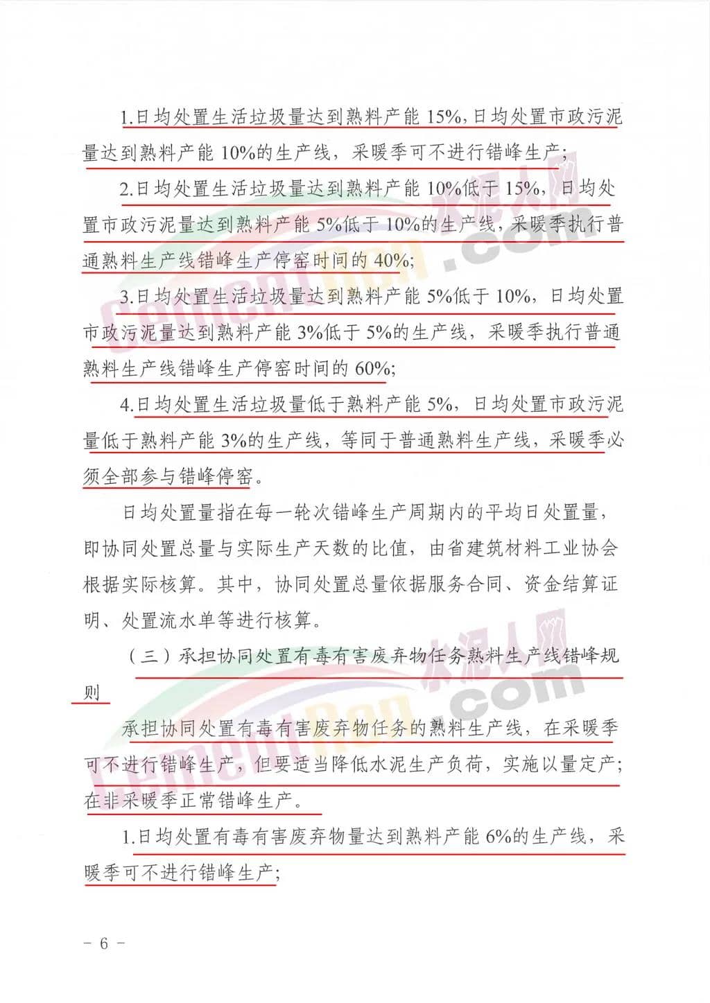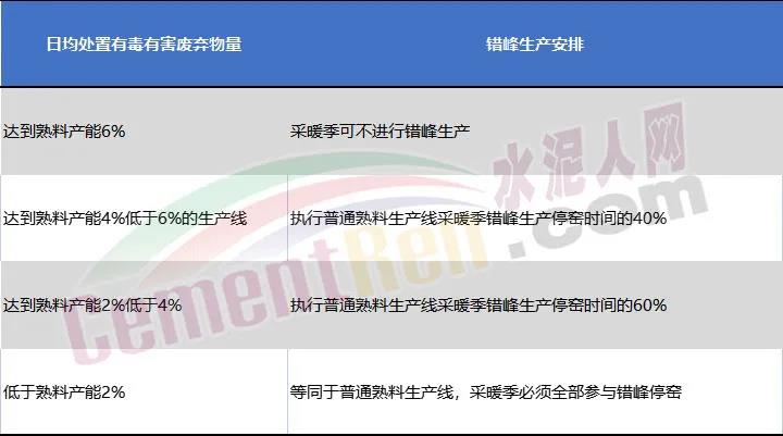 承擔(dān)協(xié)同處置有毒有害廢棄物任務(wù)熟料生產(chǎn)線錯峰規(guī)則承擔(dān)協(xié)同處置有毒有害廢棄物任務(wù)的熟料生產(chǎn)線,在采暖季可不進行錯峰生產(chǎn),但要適當降低水泥生產(chǎn)負荷,實施以量定產(chǎn);在非采暖季正常錯峰生產(chǎn)。