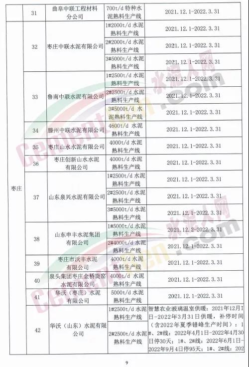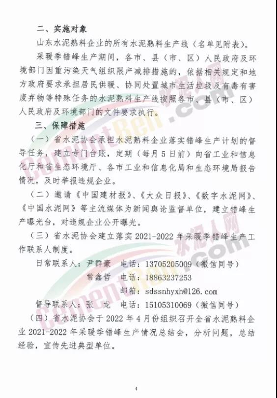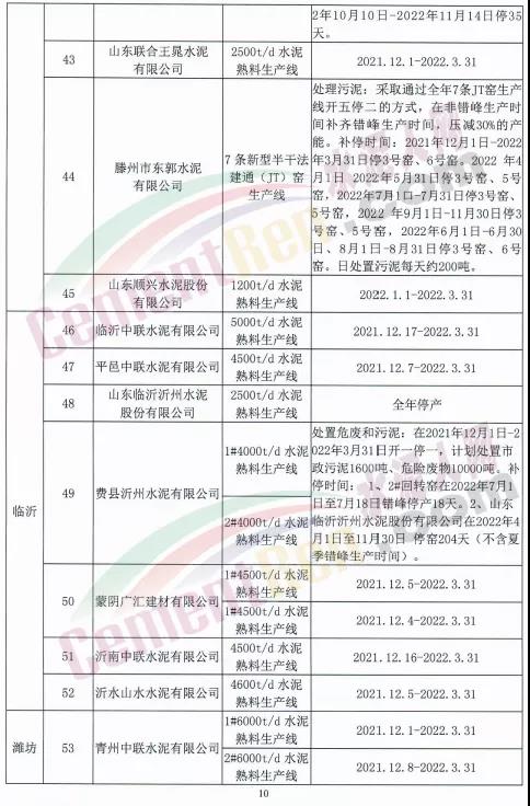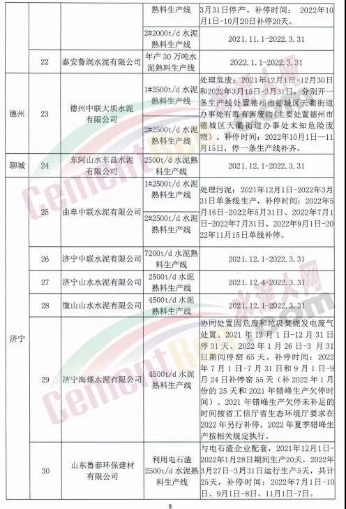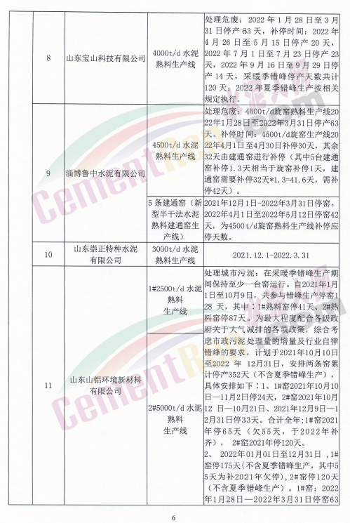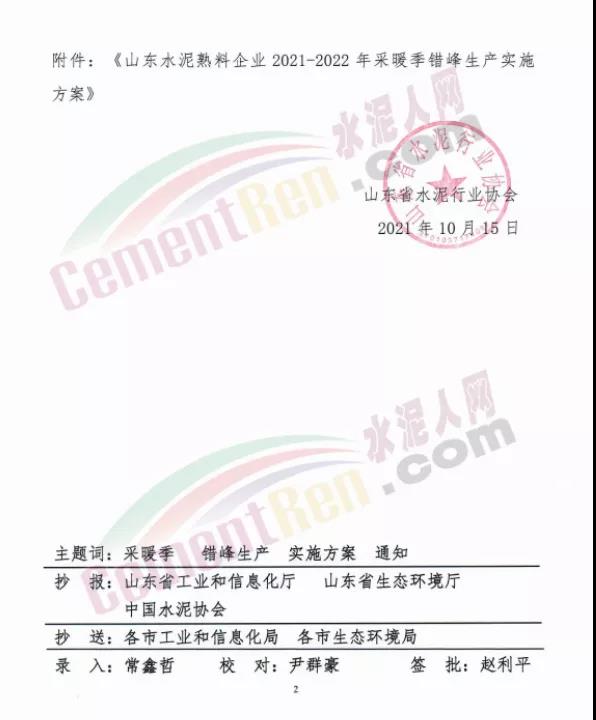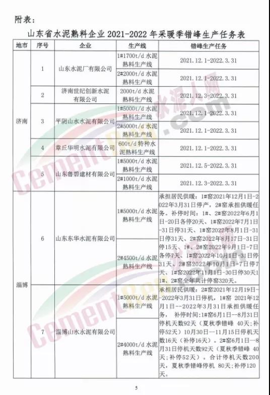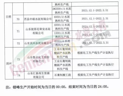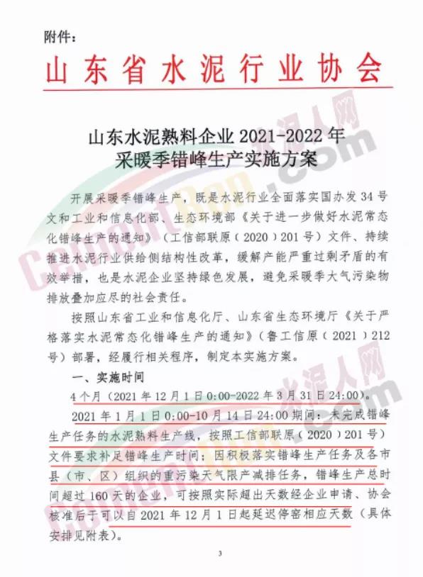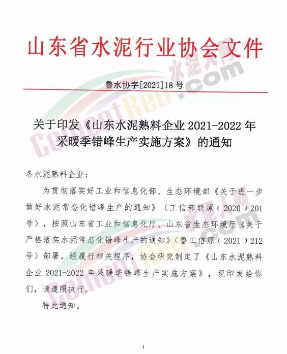 10月15日,山東省水泥行業(yè)協(xié)會(huì)發(fā)布山東水泥熟料企業(yè)2021-2022年采暖季錯(cuò)峰生產(chǎn)實(shí)施方案要求,山東水泥熟料企業(yè)的所有水泥熟料生產(chǎn)線2021年12月1日0:00-2022年3月31日24:00實(shí)施錯(cuò)峰生產(chǎn)。