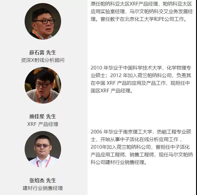 此外,本次研討會更是邀請到了多為行業(yè)重量級應(yīng)用專家,其中,資深 X射線分析顧問薛石雷一先生、XRF產(chǎn)品經(jīng)理熊佳星先生、建材行業(yè)銷售經(jīng)理張紹杰先生將在線為您帶來馬爾文帕納科 XRF、XRD、CNA中子活化跨帶分析、在線粒度分析、制樣設(shè)備、智能化實驗室等行業(yè)應(yīng)用分享,針對性的介紹水泥生產(chǎn)中每一個環(huán)節(jié)的馬爾文帕納科解決方案;并對日常儀器的使用和維護(hù)在線答疑。