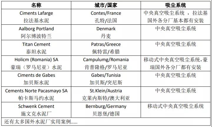 據(jù)水泥人網(wǎng)了解,在世界范圍內(nèi),目前最有效、最高效的粉塵清潔方式,采用純吸的方式(純吸無揚(yáng)塵,無二次污染),可高效快速的吸走粉塵,一次徹底清掃,杜絕二次污染,一套系統(tǒng)可抵多套普通吸塵器,可降低企業(yè)生產(chǎn)成本,提高生產(chǎn)效率,減少人力物力,實(shí)現(xiàn)清潔生產(chǎn)。該套系統(tǒng)在國外水泥廠各車間都是標(biāo)配設(shè)備,為此小編特意查閱了世界水泥工廠使用案例,真是不勝枚舉,在此先簡單羅列幾個(gè)。