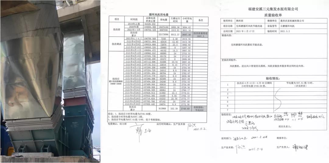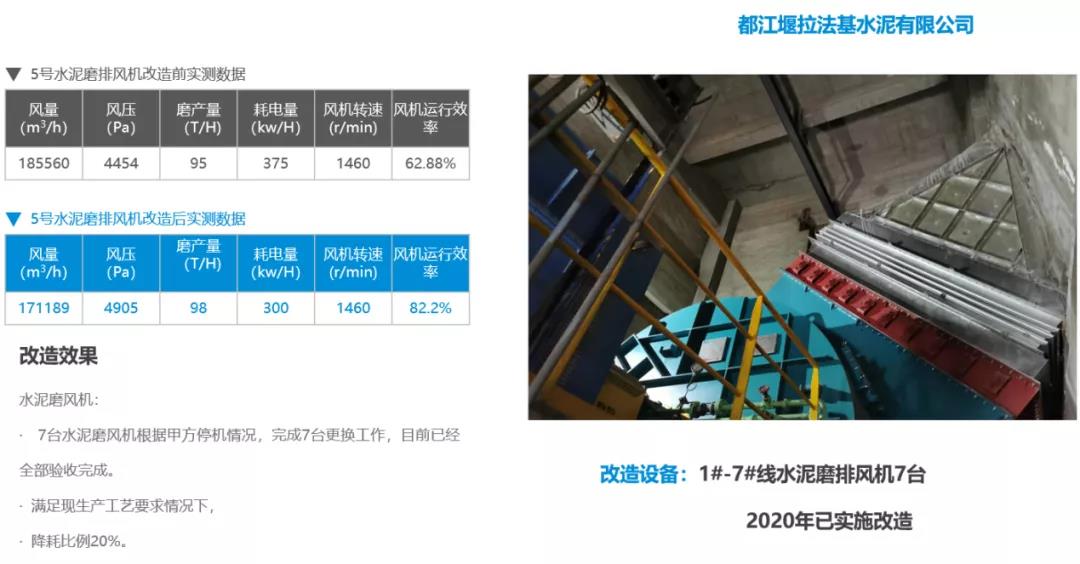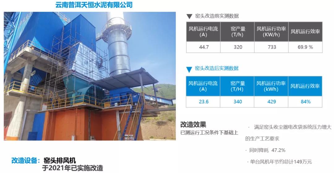 該項目于2021年實施改造,生料磨循環(huán)風機改造后同比運行功率下降937kW。