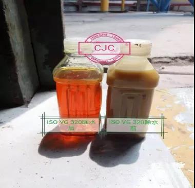 冀東水泥C企業(yè)在現(xiàn)場(chǎng)調(diào)試精密過濾系統(tǒng)時(shí),意外發(fā)現(xiàn)齒輪箱ISO VG 320齒輪油嚴(yán)重乳化,從現(xiàn)場(chǎng)維修反饋,系統(tǒng)沒有漏水點(diǎn),有可能雨水泄露進(jìn)齒輪油箱。采用CJC木質(zhì)纖維濾芯吸附齒輪油乳化水,很快將水吸收干凈。但是濾芯吸收水成本較高,每個(gè)27/27濾芯只能吸收2L乳化水,因此盡量避免油箱漏水。現(xiàn)場(chǎng)照片見圖1。
