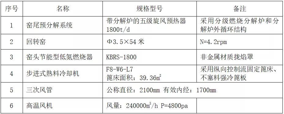 據(jù)科邦高級(jí)工程師郭紅軍介紹,采用這項(xiàng)技術(shù)的水泥廠,設(shè)計(jì)生產(chǎn)規(guī)模為1800t/d,配備Φ3.5*54米回轉(zhuǎn)窯,窯尾采用帶分解爐的五級(jí)旋風(fēng)預(yù)熱器,采用升級(jí)型的第四代步進(jìn)式篦冷機(jī),窯頭采用節(jié)能型低氮燃燒器。燒成系統(tǒng)主要設(shè)備配置情況見下表: