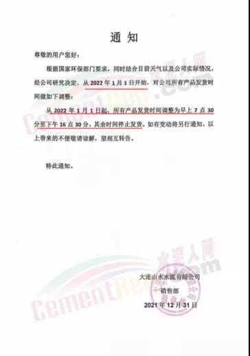 日前大連山水水泥有限公司通知,根據(jù)國家環(huán)保部門要求,同時結(jié)合目前天氣以及公司實際情況,經(jīng)公司研究決定,從2022年1月1日開始,對公司所有產(chǎn)品發(fā)貨時間做出調(diào)整:從2022年1月1日起,所有產(chǎn)品發(fā)貨時間調(diào)整為早上7點 30分至下午16點30分,其余時間停止發(fā)貨。