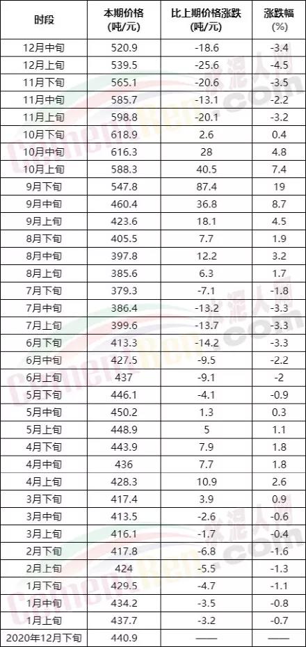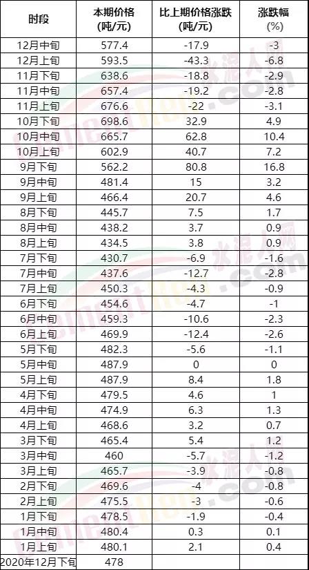 P.O42.5散裝水泥均價最高時段為10月下旬,均價618.9元/噸;均價最低時段為7月下旬,均價379.3元/噸。最高價與最低價相差239.6元/噸。