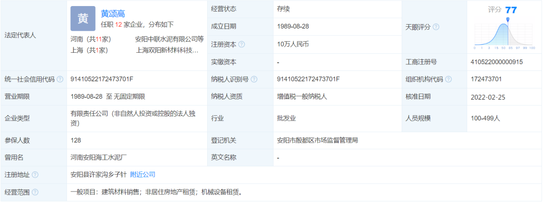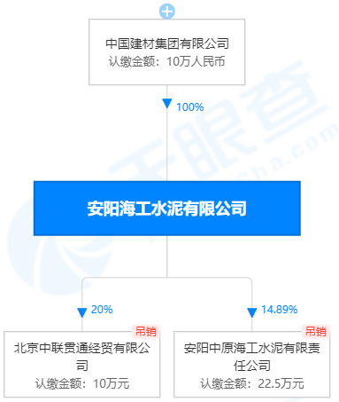 安陽中聯(lián)水泥有限公司成立于2006年8月8日,法定代表人為劉宗虎,注冊(cè)資本為6億元,經(jīng)營范圍含發(fā)電、輸電、供電業(yè)務(wù)等。目前,該公司由安陽中海新材料有限公司、河南中聯(lián)同力材料有限公司共同持股,持股比例均為50%。