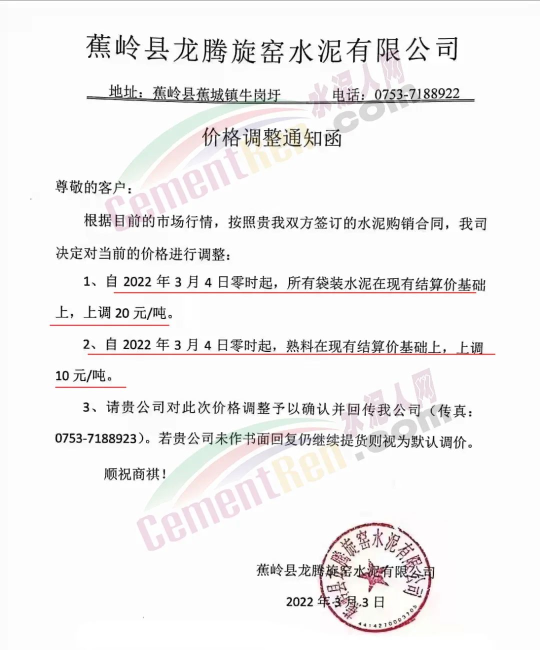 梅州寧江水泥有限公司銷售部通知,經(jīng)公司研究決定并授權(quán)銷售部發(fā)出通知,從2022年3月4日零時(shí)起,本公司生產(chǎn)的所有袋裝水泥,出廠價(jià)格在現(xiàn)行價(jià)格基礎(chǔ)上上調(diào)20元/噸。