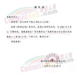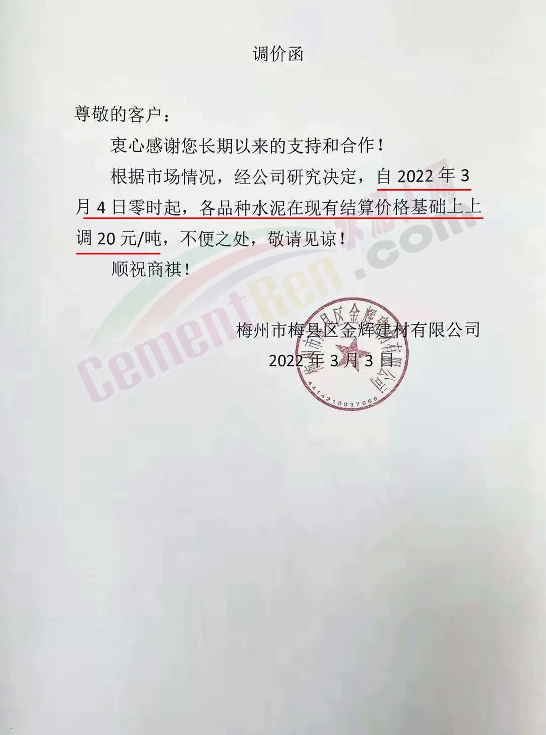 梅州市梅縣區(qū)金輝建材有限公司通知,根據(jù)市場(chǎng)情況,經(jīng)公司研究決定,自2022年3月4日零時(shí)起,各品種水泥在現(xiàn)有結(jié)算價(jià)格基礎(chǔ)上上調(diào)20元/噸。