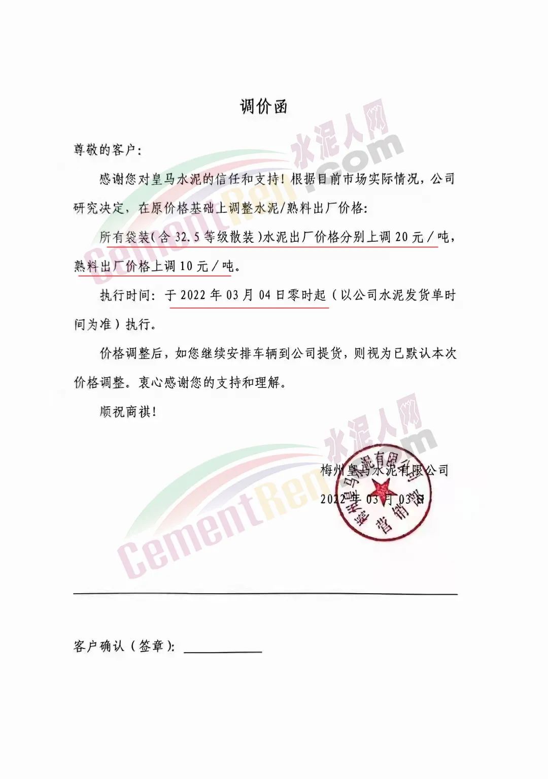 梅州皇馬水泥有限公司通知,根據(jù)目前市場(chǎng)實(shí)際情況,公司研究決定,自2022年3月4日零時(shí)起所有袋裝(含32.5等級(jí)散裝)水泥出廠價(jià)格分別上調(diào) 20元/噸,熟料出廠價(jià)格上調(diào)10元/噸。