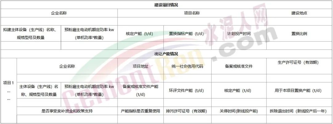 (二)用于置換的產(chǎn)能所屬企業(yè)名稱,統(tǒng)一社會信用代碼,主體設(shè)備(生產(chǎn)線)所在具體位置,企業(yè)的水泥生產(chǎn)許可證號及有效期,主體設(shè)備(生產(chǎn)線)名稱、規(guī)格型號及數(shù)量,備案或核準(zhǔn)文件上的設(shè)計產(chǎn)能,實際產(chǎn)能,核定產(chǎn)能,用于本項目置換產(chǎn)能,計劃關(guān)停時間,計劃拆除時間。