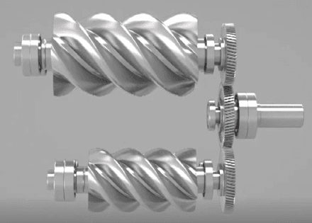 1. 主機采用高效雙級壓縮,由主齒輪帶動兩個同步齒輪,驅(qū)動兩個壓縮主機。均分及降低了壓縮比,減少泄漏量,提高容積效率。