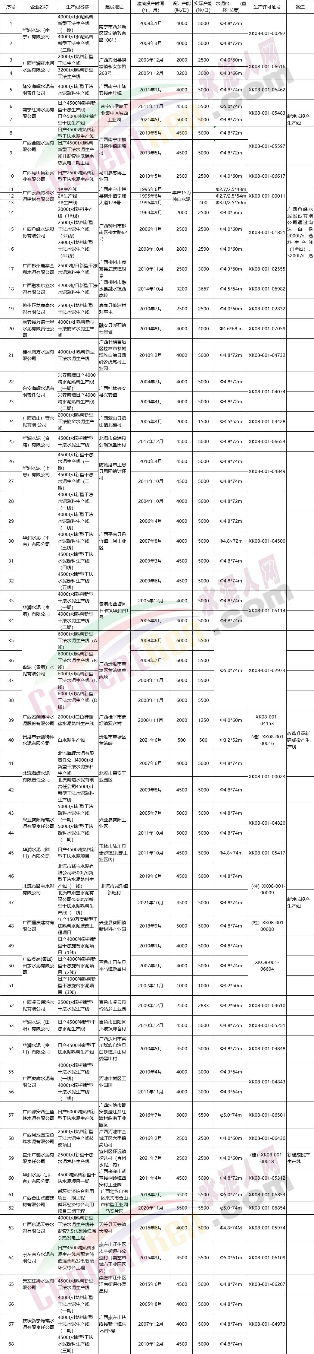 日前,廣西壯族自治區(qū)工信廳發(fā)布截至2021年12月31日的水泥熟料生產(chǎn)線清單顯示,廣西壯族自治區(qū)內(nèi)截止2021年底共有68條熟料生產(chǎn)線,合計產(chǎn)能達8449.5萬噸/年。