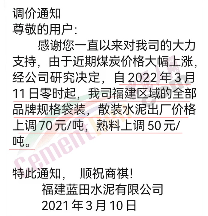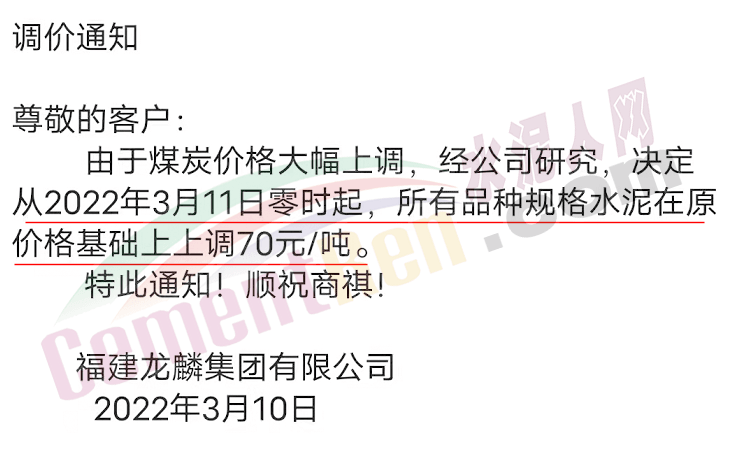 因原材料成本大幅上漲,根據(jù)目前市場(chǎng)行情,經(jīng)公司研究決定,自2022年3月11日零時(shí)起我司發(fā)往各區(qū)域的各品種各型號(hào)水泥出廠單價(jià)上調(diào)70元/噸。