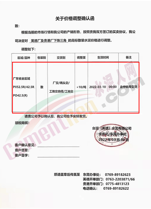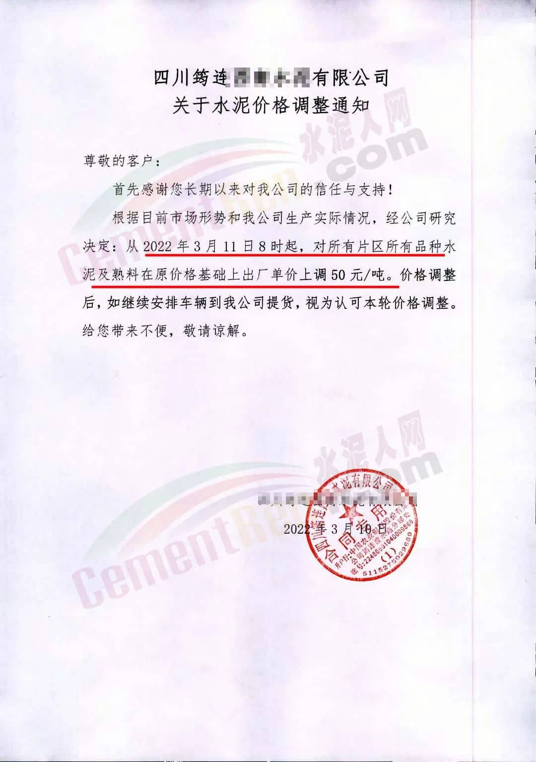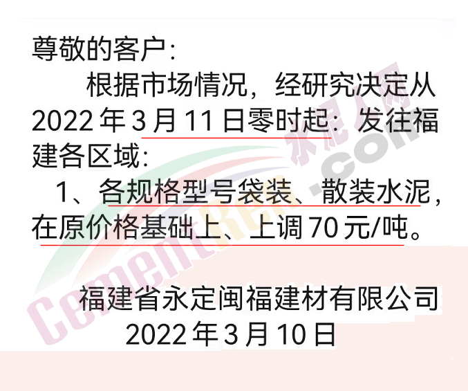 基于目前市場(chǎng)行情,結(jié)合我司實(shí)際情況,經(jīng)我公司研究決定,自2022年03月11日零時(shí)起,我公司發(fā)往全區(qū)域的各品牌、品種袋裝、散裝水泥、熟料的出廠價(jià)格,在原有基礎(chǔ)上上調(diào): 70元/噸。