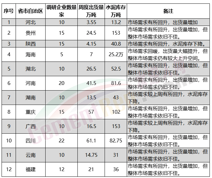 據(jù)水泥人網(wǎng)信息中心重點(diǎn)調(diào)研的12個(gè)區(qū)域數(shù)據(jù)來看,近一周內(nèi)出貨量有所增加,水泥庫(kù)存下降明顯,但是絕大多數(shù)區(qū)域整體市場(chǎng)需求仍呈現(xiàn)低迷狀態(tài)。甚至有個(gè)別企業(yè)調(diào)價(jià)后,出貨量大幅下降。更多區(qū)域出現(xiàn)市場(chǎng)高價(jià)“空轉(zhuǎn)”現(xiàn)象。