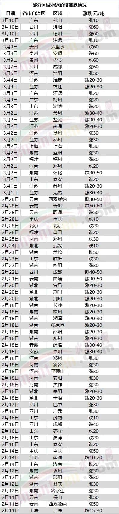3月10日福建華潤(rùn)水泥、藍(lán)田水泥、永定閩福建材、永安謀成水泥、福建金牛水泥、龍麟集團(tuán)、鑫城水泥、大縣新巖、春馳新豐等水泥企業(yè)通知自11日起上調(diào)水泥價(jià)格70元/噸, 藍(lán)田水泥熟料同步上調(diào)50元/噸。