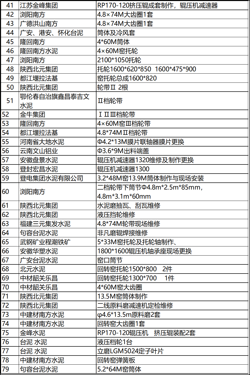 超盛重工水泥行業(yè)部分業(yè)績(jī)表